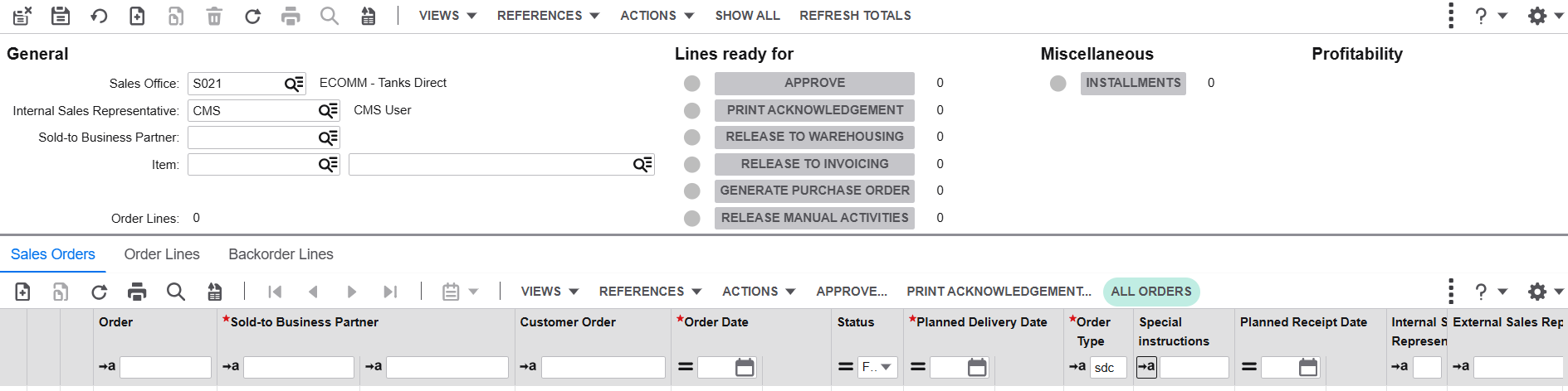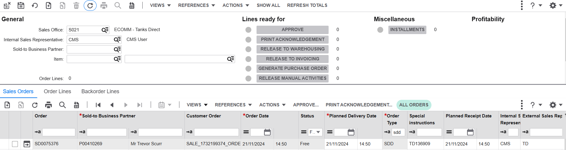 SDD - Third Party order - these are Tanks Direct responsibility to process. Your own orders will appear with your LN user name in the 'Internal Sales Representative' field and set 'Order Type' to SDD (web orders are CMS). This process requires you to send the purchase order to Docman.